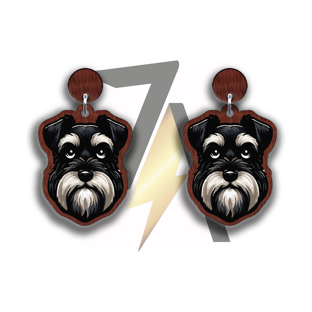 These wooden planar earrings showcase a striking Black Schnauzer face design, capturing the breed's distinctive and spirited features. Known for their expressive eyes, bushy eyebrows, and bearded muzzle, Black Schnauzers exude a charismatic and lively personality. Made from lightweight, sustainable wood, these earrings offer a rustic charm while being eco-friendly. Equipped with surgical steel studs, they ensure a secure and hypoallergenic fit, perfect for dog lovers who appreciate a unique and stylish accessory for casual or playful outfits.