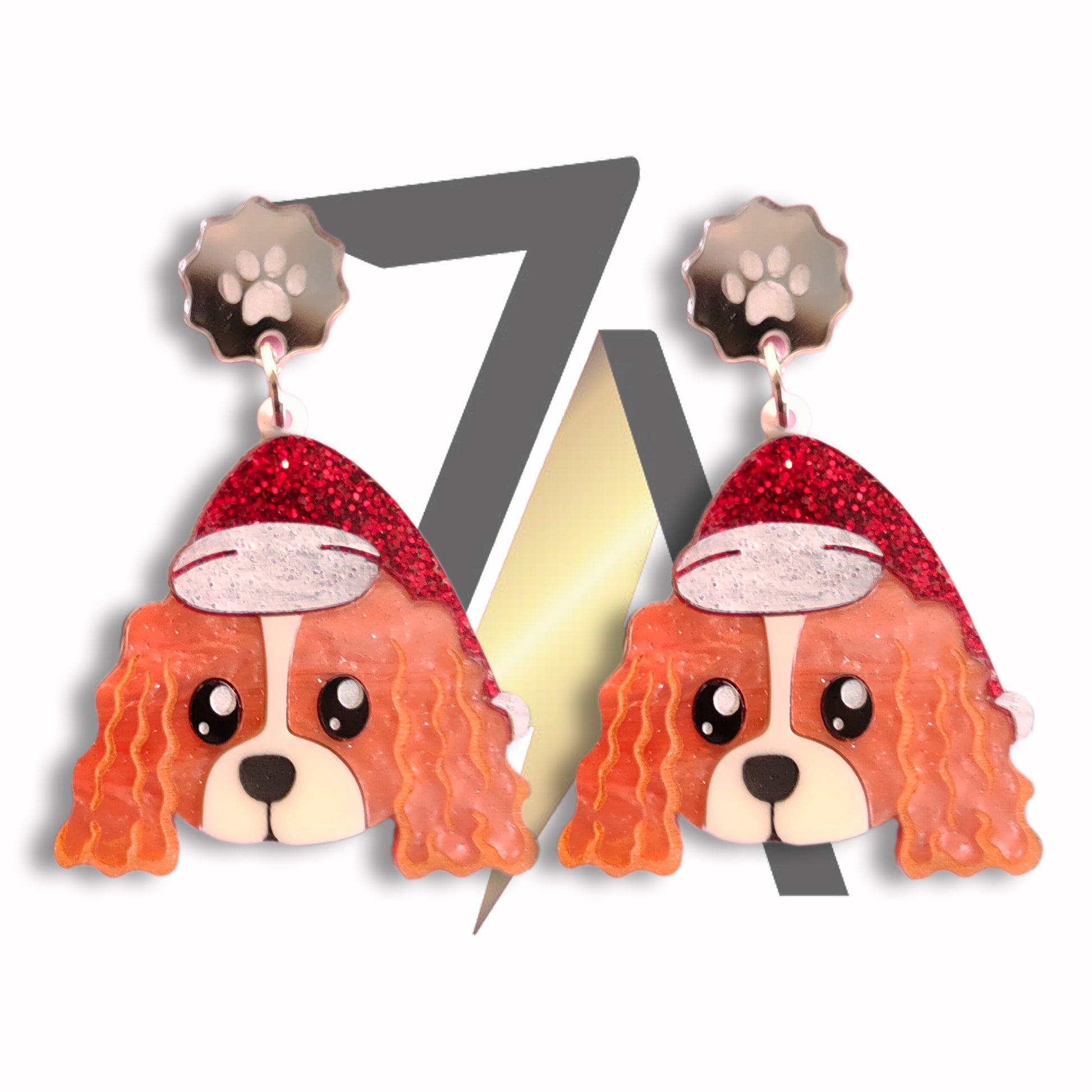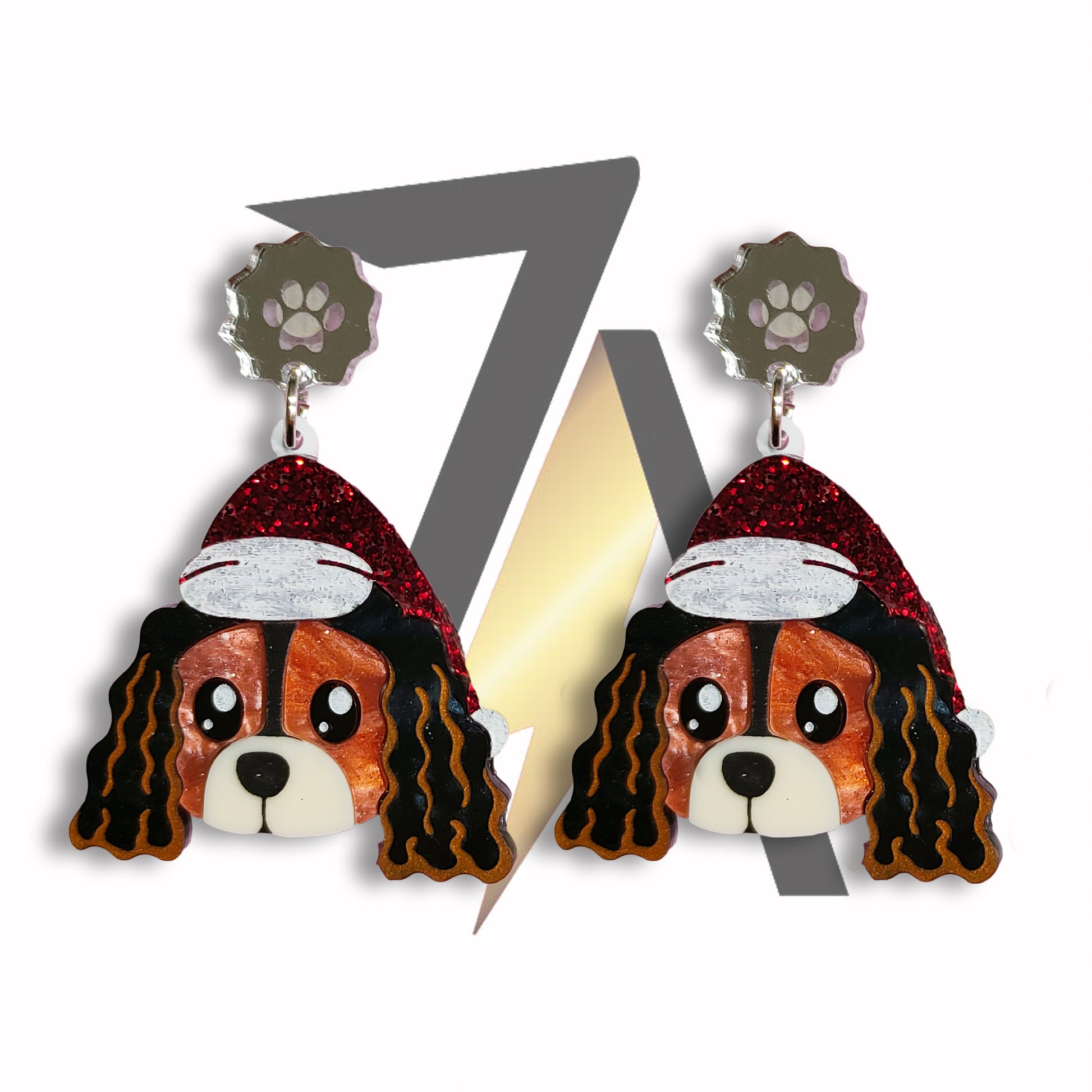 Cavalier Dog with Santa Hat Dangle Sterling Silver Earrings