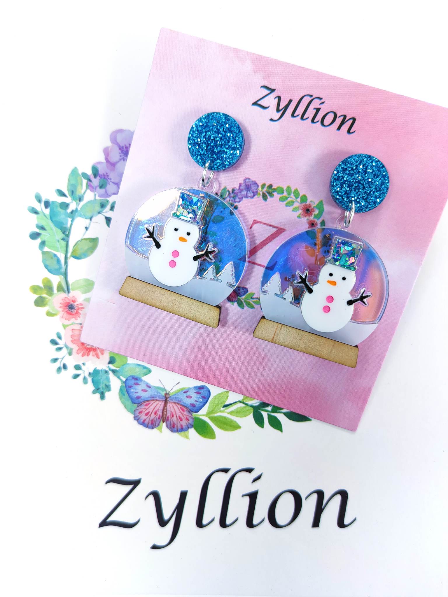 Christmas snowman in a crystal ball dangle Sterling Silver Earrings