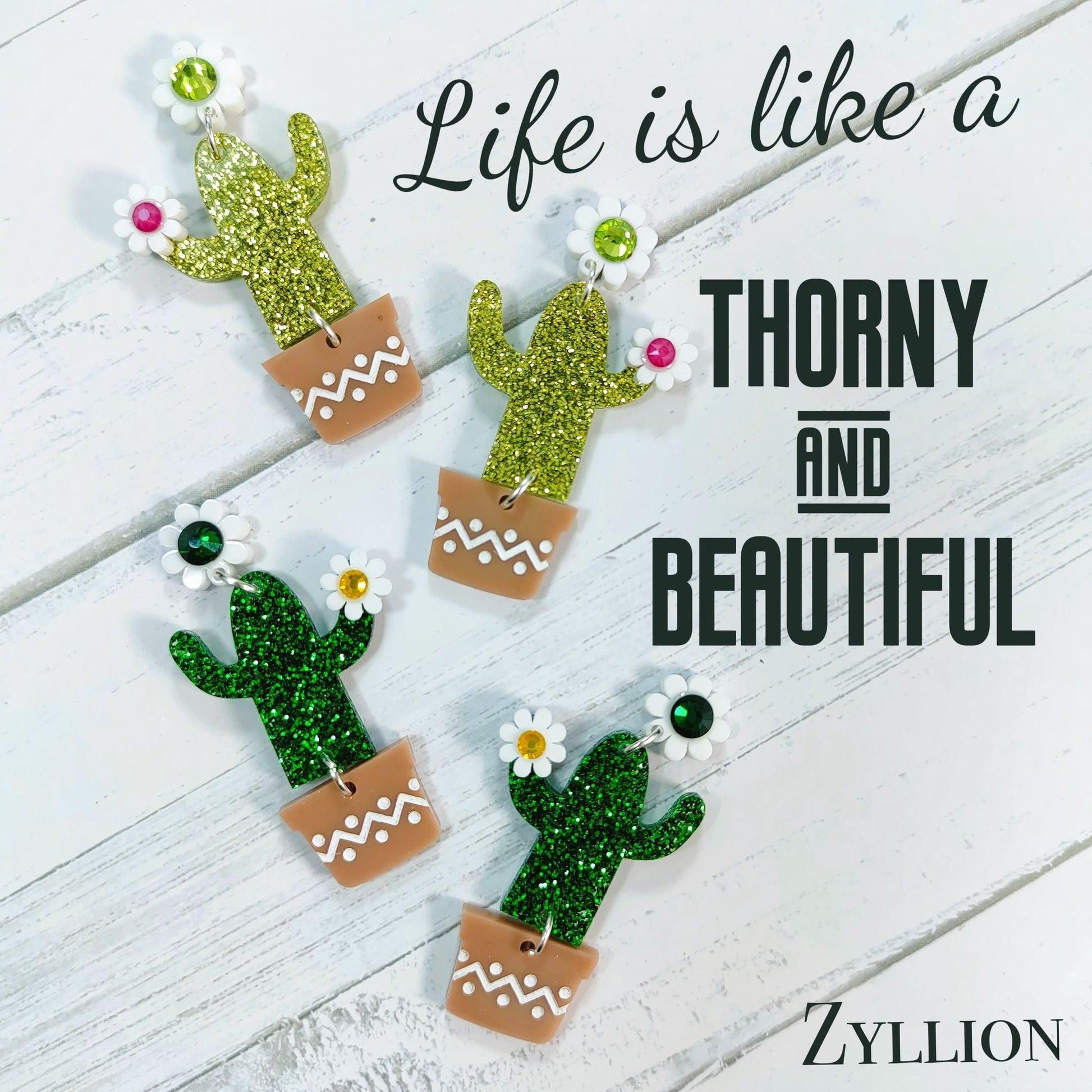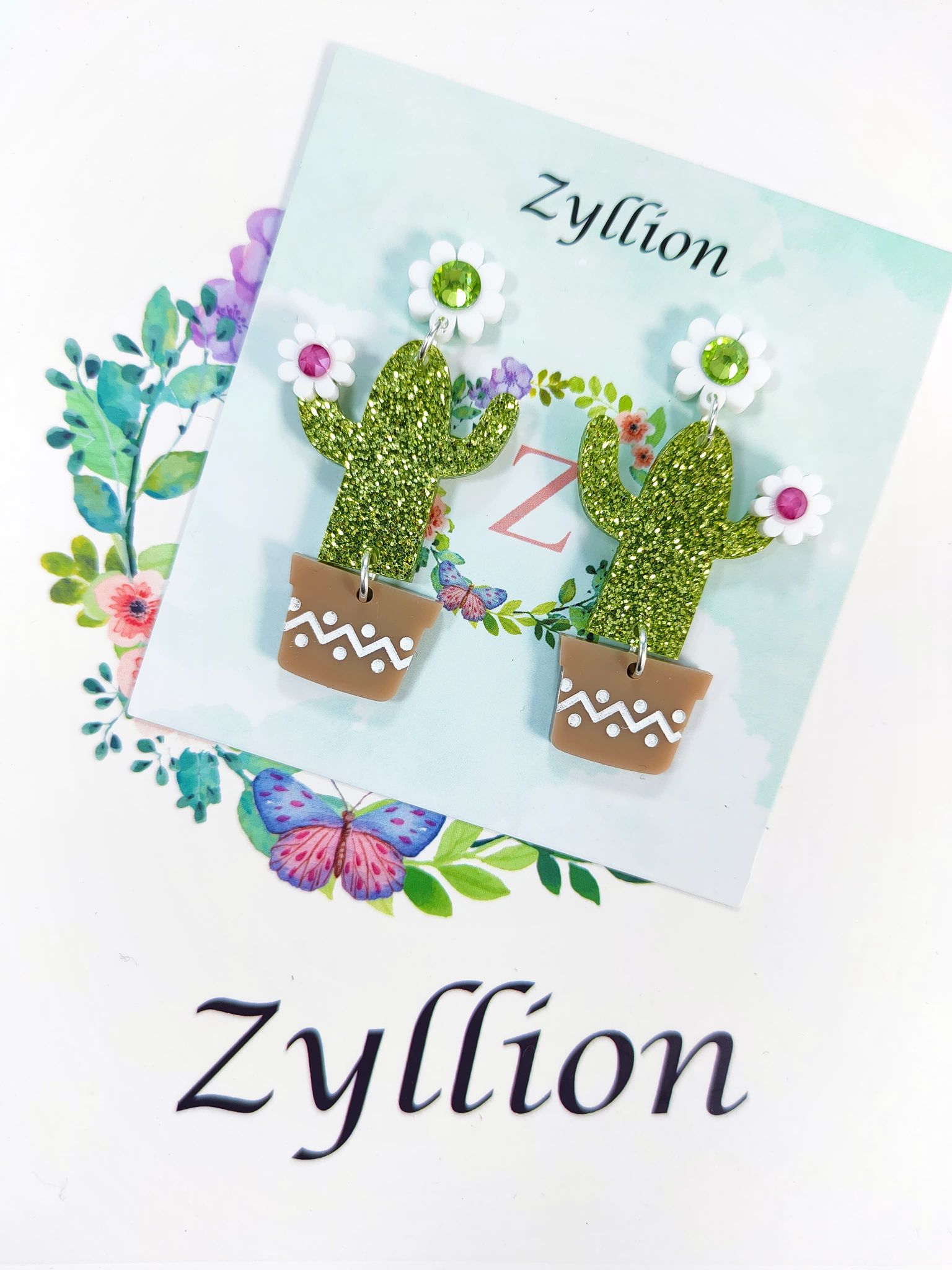 Crystal Cactus flower pot Dangle Sterling Silver Earrings