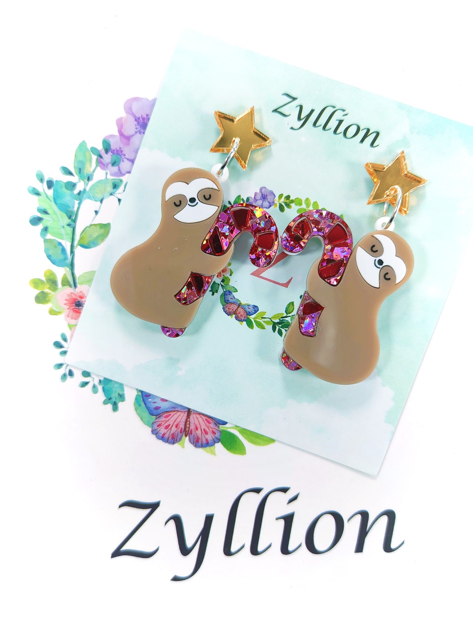 Sloth hugging Christmas candy cane acrylic Dangle Sterling Silver Earrings