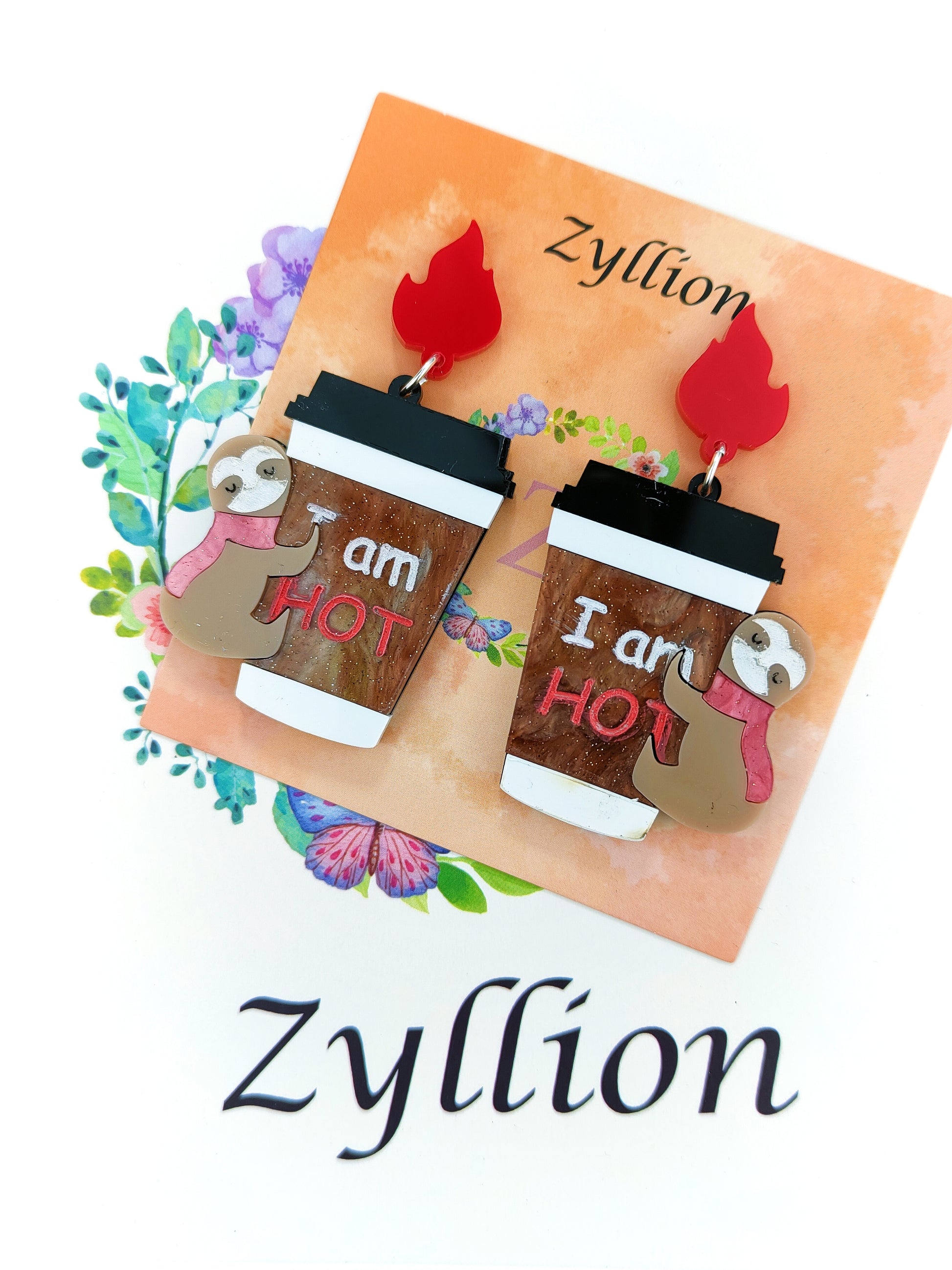 Sloth with hot coffee Dangle Sterling Silver Earrings